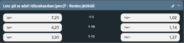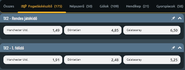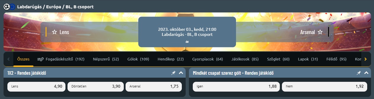 1Az egyes eseményekhez elérhető összes fogadási lehetőséget megtalálod az „Összes” fül alatt. Külön listába szedtük a Fogadáskészítőhöz elérhető piacokat, a legnépszerűbb piacokat, a gyorspiacokat, emellett egyéb piaccsoportokat is elérhetsz, hogy bármit könnyen megtalálj.