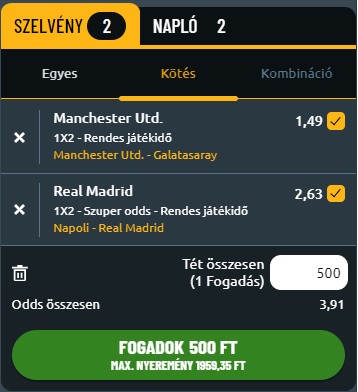 2Az érintett sportágak egyes eseményein belül a Fogadáskészítő fül alatt listázódnak azok a fogadási lehetőségek, amelyek egymással kötésben játékba küldhetőek.