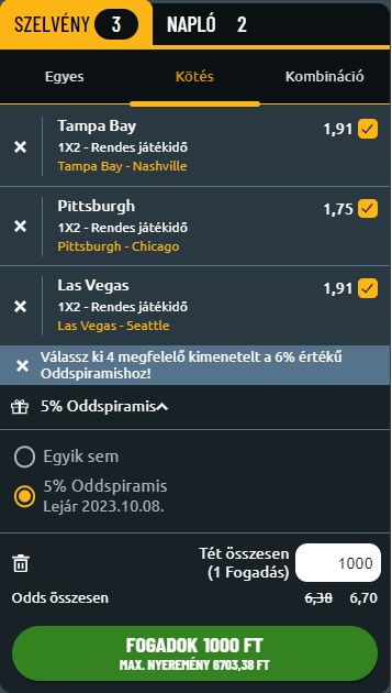 2Minél nagyobb a kötés, annál magasabb lehet az oddsod – a részleteket és az érintett eseményeket a promó aloldalon találod, amennyiben van aktív Oddspiramis..