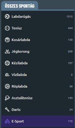 1A főoldali sportágfában és a felső menüsorból elérhető E-sport aloldalon játékokra bontva megtalálod az összes E-sport eseményt.
