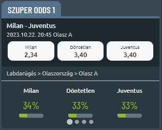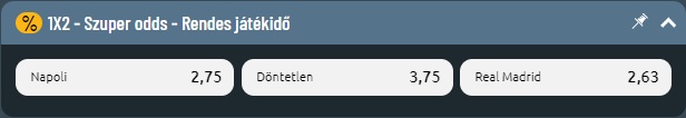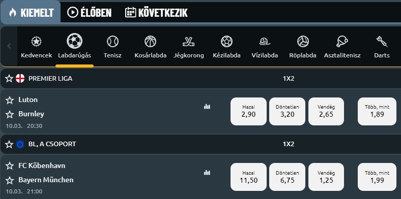 1Egyes események „1X2” vagy „Ki nyeri?” piacaira az alapesetben elérhetőnél magasabb nyereményszorzóval is fogadhatsz. A szuper oddsokat a piac elnevezése és megjelölése alapján is be tudod azonosítani.