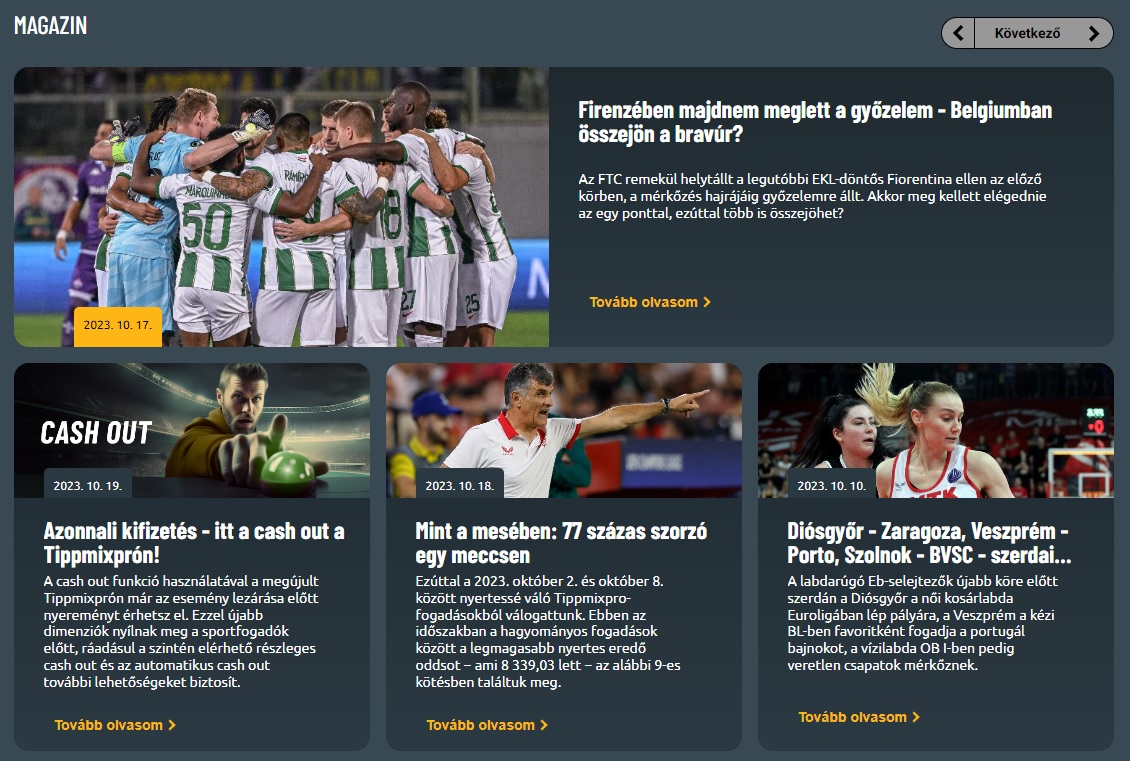 1A Magazinra a felső menüsorban, ahol fogadási érdekességekről, eseményajánlókról és promóciós lehetőségekről is tájékozódhatsz.
