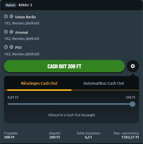 3Az automatikus cash out arra ad lehetőséget, hogy amikor a fogadásod elér egy általad előre beállított értéket, a cash out automatikusan végbemenjen, a fogadásod lezáruljon, a beállított összeg pedig jóváírásra kerüljön a számládon