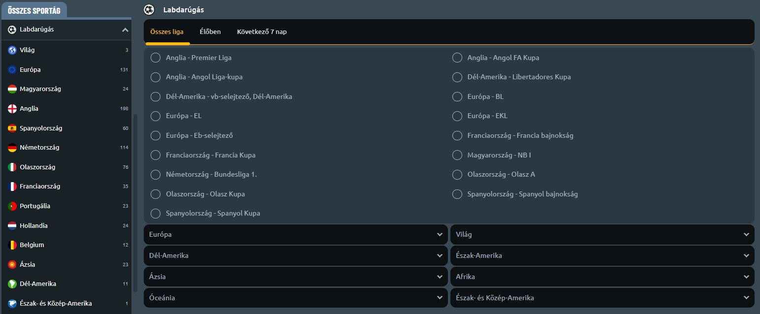 1A főoldali sportágfából az összes elérhető eseményhez eljuthatsz: a sportág kiválasztása után országot választhatsz a lenyíló listában, majd böngészhetsz az országon belüli összes elérhető bajnokság és outright között.