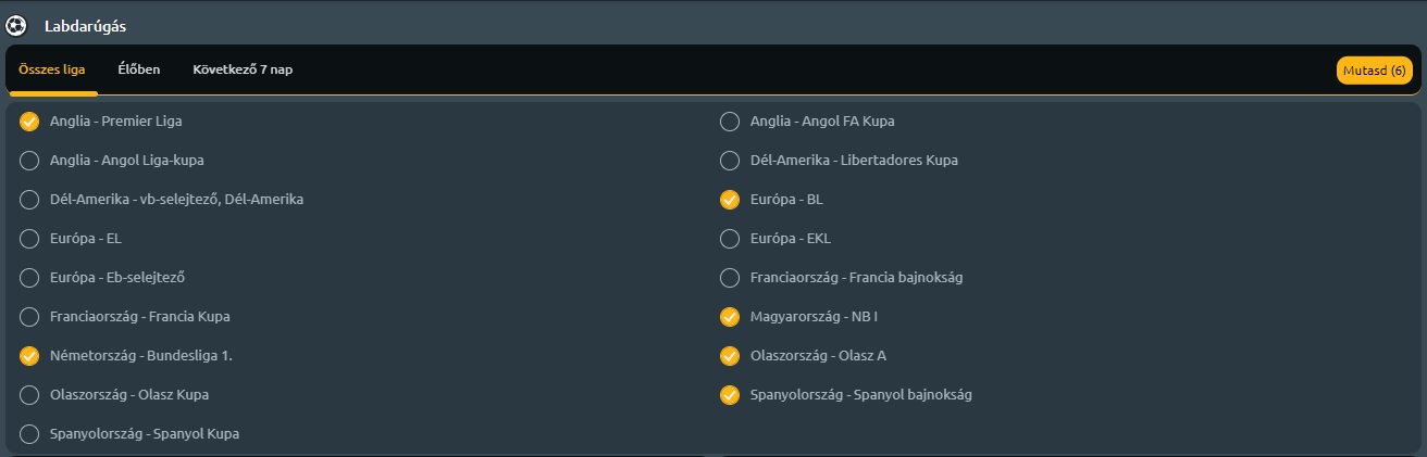 2Kattints a sportágválasztóban egy sportágra, jelöld meg a kedvenc ligáidat, majd egy kattintás után eléred a testre szabott bajnokság oldalad.